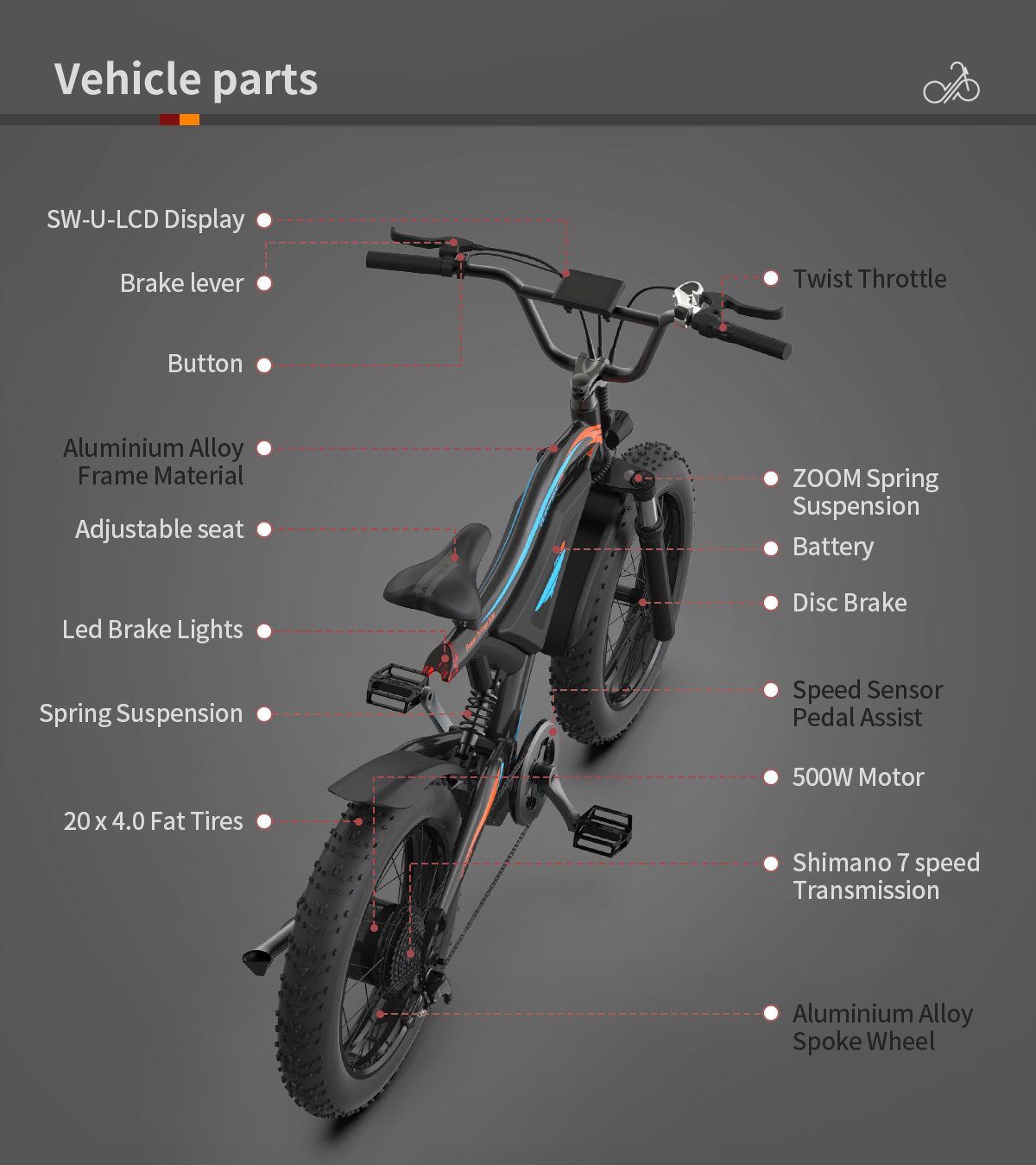 Frame6061 aluminum alloyMotor500W MotorCharge Time4-6 hoursRange Disdance25-40 kmLightWith front light/tail-lightForkZOOMDerailleurOuter 7 speed SHIMANOBattery48V 15Ah lithium batteryController48V 22AMax Speed40 km/hBrakeF/R Mechanical brakeDisplaySW-U-LCD displayTire20 x 4.0