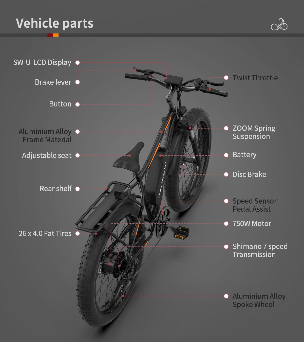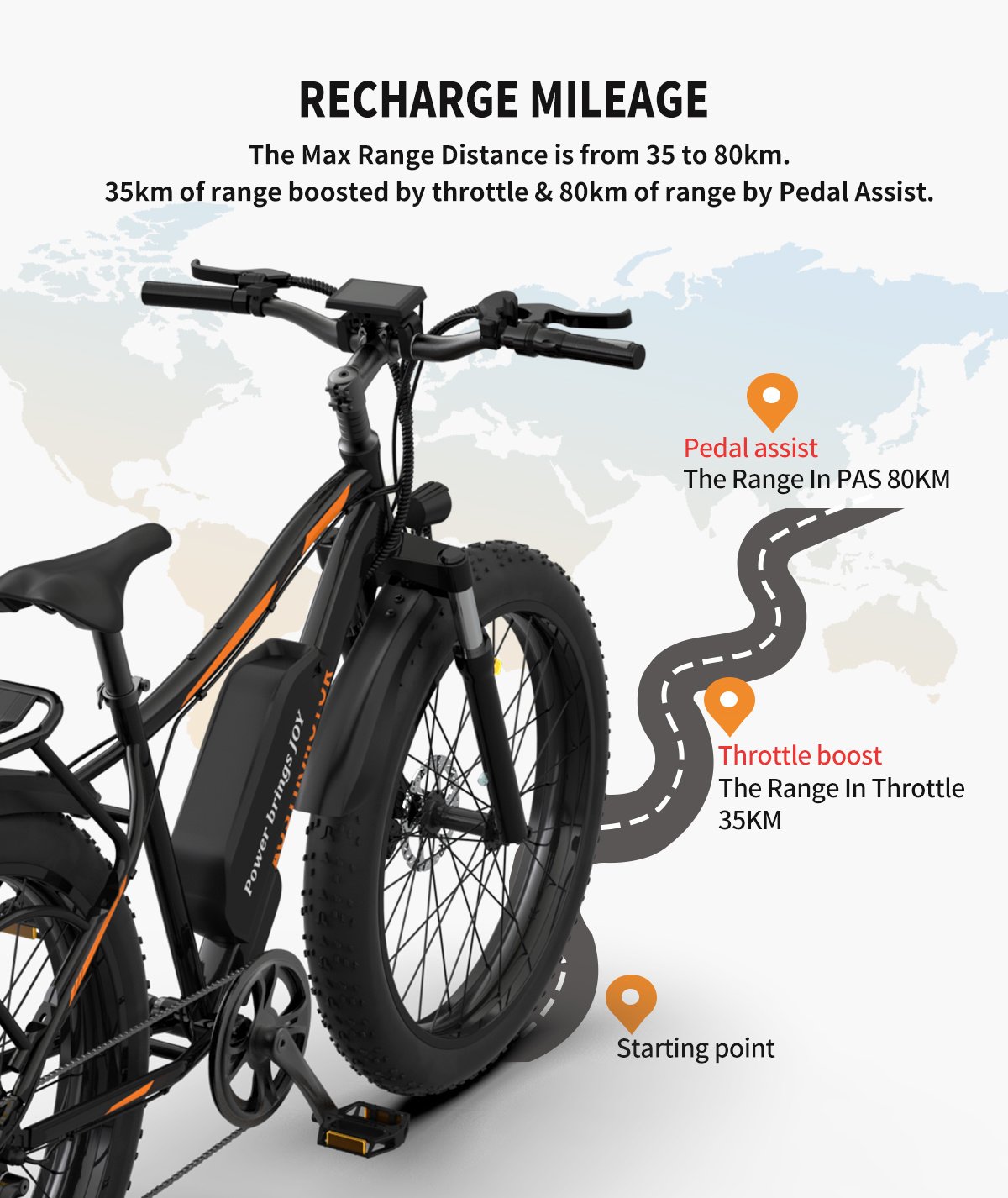 750W motor with Strong driving force and long endurance. Power: Pedal assist on-demand and throttle