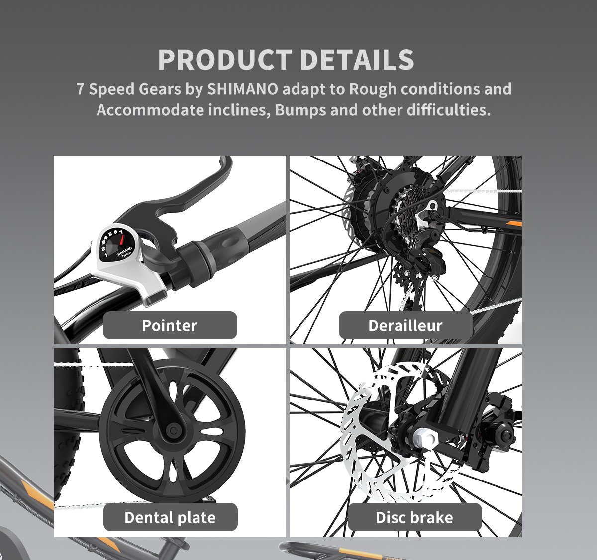 Frame6061 aluminum alloyMotor750W MotorCharge Time4-6 hoursRange Disdance25-40 kmLightWith front lightForkZOOMDerailleurOuter 7 speed SHIMANOBattery48V 13 Ah lithium batteryController48V 22AMax Speed45 km/hBrakeF/R Mechanical brakeDisplaySW-U-LCD displayTire26 x 4.0