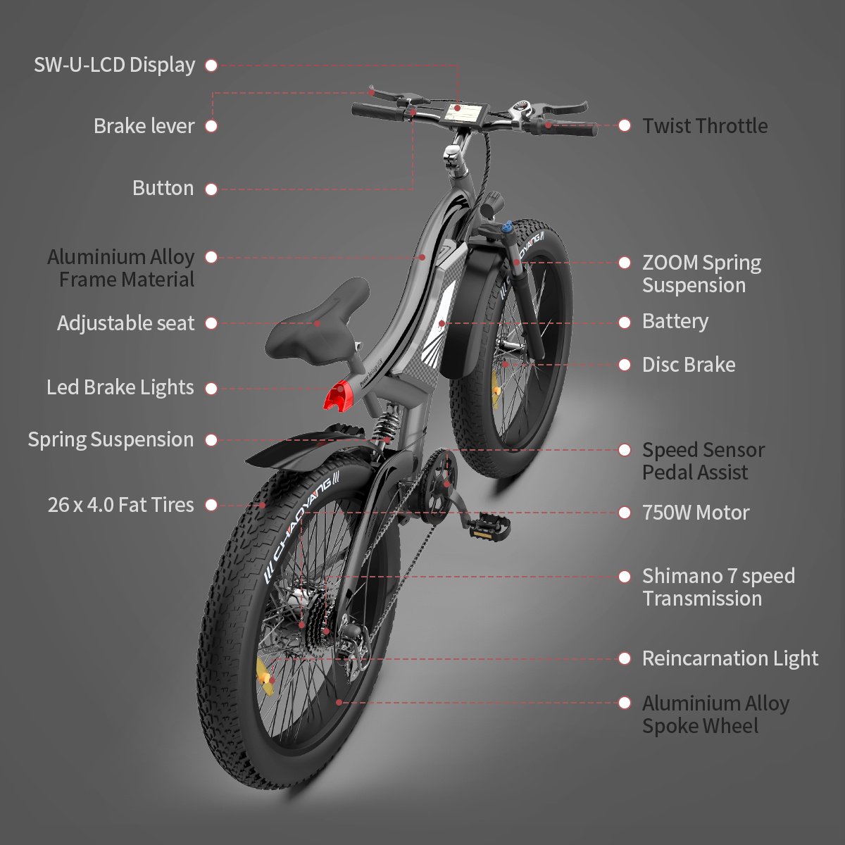 Frame6061 aluminum alloyMotor750W MotorCharge Time4-6 hoursRange Disdance25-40 kmLightWith front light/tail-lightForkZOOMDerailleurOuter 7 speed SHIMANOBattery48V 15 Ah lithium batteryController48V 22AMax Speed45 km/hBrakeF/R Mechanical brakeDisplaySW-U-LCD displayTire26 x 4.0