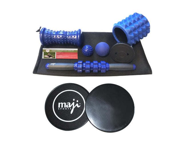 MUSCLE RECOVERY BUNDLE:Silicone Trigger Point BallSize: 6.3 cm- Helps to relieve knots in your muscles that are also known as trigger points, which lead to Myofascial Pain Syndrome.- Relieve tight muscles in the lower back, neck & glutes- Great tool to help release and achieve melting of minor aches and pains to muscular tissue.- Material Composition : SiliconeDeep Tissue Roller StickSize : 14.5'- Increases blood flow to hurting and sore muscles in calves, quads, hams & thighs- Reduces lactic acid & improves sports performance- Reduces muscle knots & trigger points- Accelerates muscle recovery- Improves strength & flexibility to muscles and joints- Middle: 100% PP, Handle: 70% PP, 30% NBRFoot massagerSize: 5 cm- Relieves stiffened muscles and tissues in hands, arms, legs & feet- Stimulates & soothes any sore or tired muscles when you roll it under your feet- A great choice for relieving plantar fasciitis- Small size makes it easy to carry and also use it anytime & anywhere- Material Composition 100% TPRFoot massagerSize: 7.5 x 17.5 cm- The massage roller can be used on your feet, calves, hams, glutes, hands & forms- The massage roller can be used for plantar fasciitis as well as for relieving heel & foot arch pain- The unique pressure points and arc design of the massage roller can greatly relieve muscle pain- High quality PVC material- An ideal product which can be taken to work and on trips in a briefcase or carry-on bag- Material Composition : 100% PVC of High QualityMini Travel Foam RollerSize : 5.1' x 4.7"- Eco-certified EVA foam, SGS passed - 100% raw material, EVA foam- Unique design with dimpled surface for deeper massage to relieve muscular pain and tightness similar to the thumbs of a massage therapist- Stretches muscles and other soft tissues in multiple directions, breaking down "knots" to help increase your flexibility and help relieve back pain- Compact enough to travel withOutside : 100% EVA, Inner : 100 % EVA- Maji Sports Sliding Core Exercise Discs can broaden your range of exercises while reducing your risk of injury.- Perfect for core toning exercises.- The smooth, shiny side works on carpet and the soft side works on hardwood or tile floors.- Maji Sports Sliding Core Exercise Discs engage your core muscles while introducing a balance challenge.- The long movements are also a good way to increase flexibility.