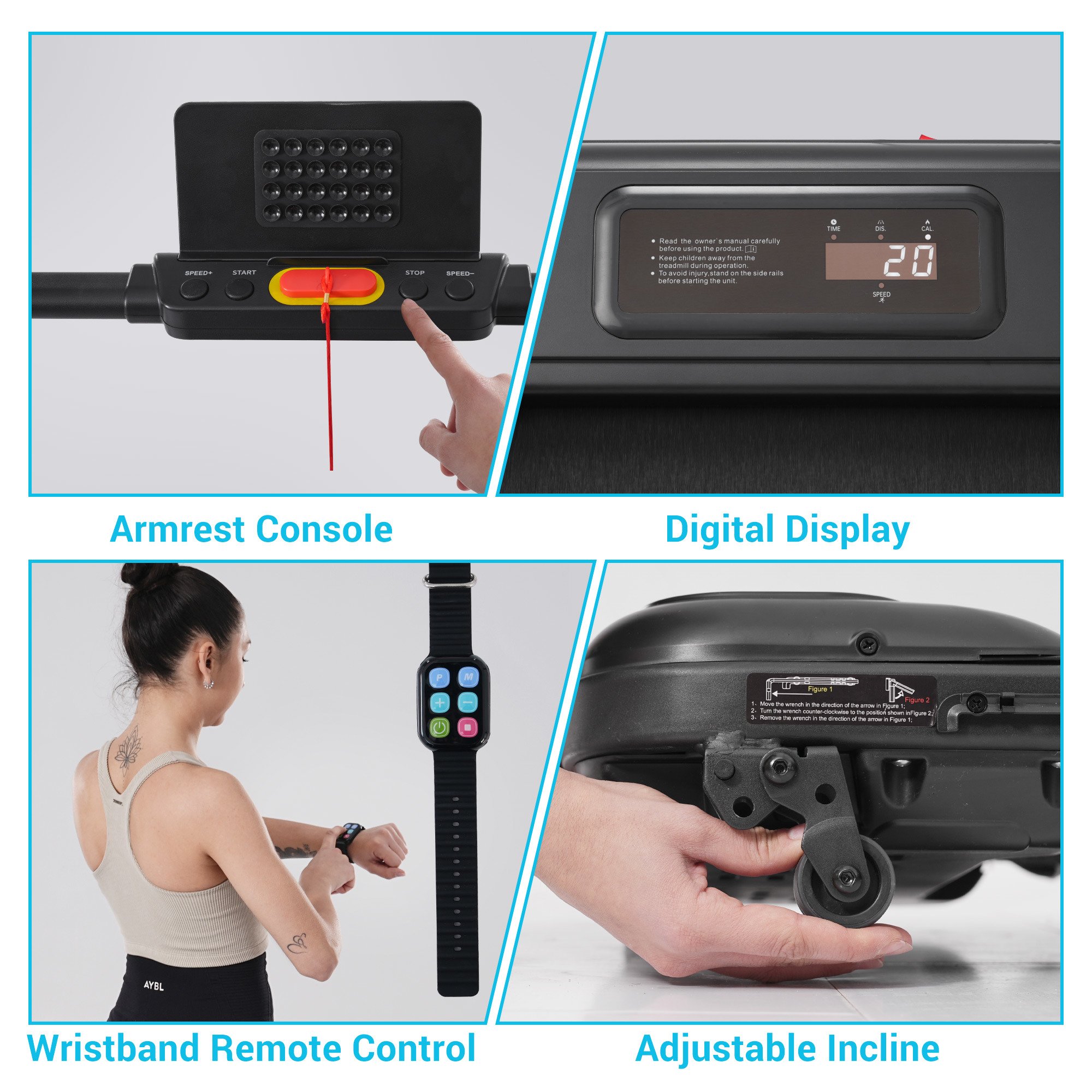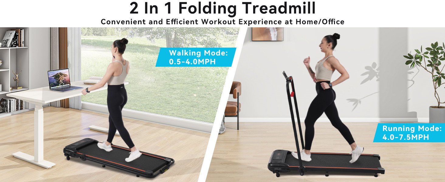 INNOVATIVE 2-IN-1 FOLDING TREADMILL -- Compared to ordinary treadmills, our 2-in-1 treadmill has 2 modes to meet your different sports needs. When the riser is folded, it can be used as a jogging machine at a speed of 0.5MPH-4MPH, when the handrail is raised, the running speed is 4MPH-7.5MPH.POWERFUL 2.5HP -- With a powerful and ultra-quiet 2.5HP motor and load a max weight capacity of 265lbs, this treadmill allows you to walk or run without disturbing others, making it ideal for home and office use. With a sturdy and durable steel frame and multi-layer shield design, it's shock-absorbing and noise-reducing, making your running quieter, safer and more comfortable.WITH PHONE HOLDER, REMOTE CONTROL & Armrest CONTROL -- You can also use the phone holder to watch videos or chat with friends. The remote control (BATTERY NOT INCLUDED) is convenient to adjust the speed of movement and stop instantly. NO INSTALLATION -- No need to install, just take this walking pad out and use it. The dimension of the electric treadmill is 50.2"*24.8"*4.72". With transport wheels, you can easily move and store it under a sofa, bed, or behind a door, which greatly frees up some floor space.FITNESS TRACKING DISPLAY -- Our portable Treadmill is designed with a LED display to show speed, distance, time, and calories burned, allowing you to visualize your exercise and maintain motivation. You can control the speed or stop the treadmill by pressing the remote control.PROTECT YOUR KNEES -- 5 layer anti-slip belt of this desk treadmill is designed to absorb the force of your step, to protect your joints and ligaments from damage.NEW DESIGN WITH INCLINE--New Treadmill With One Second Incline Adjustment. Burn fat more effectively