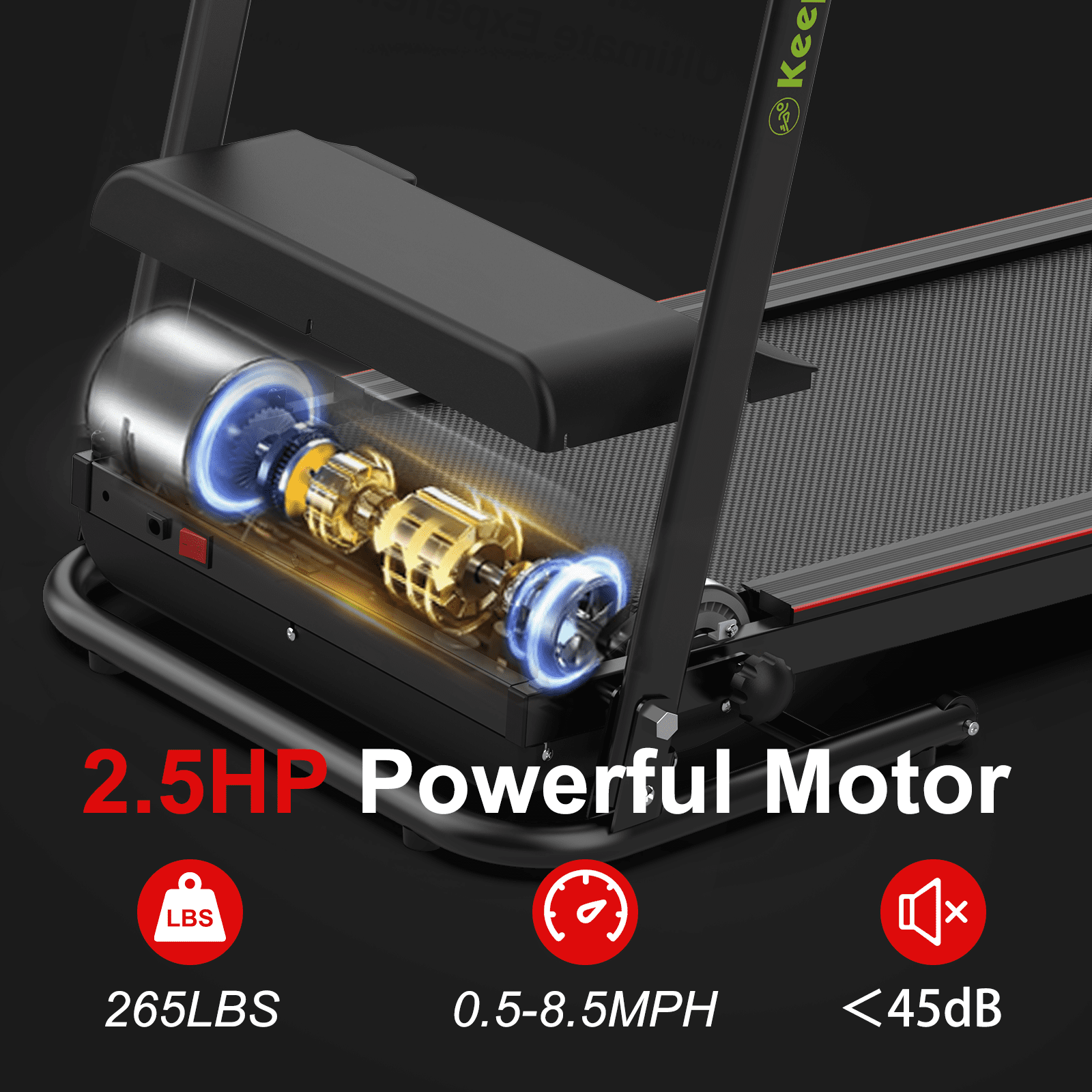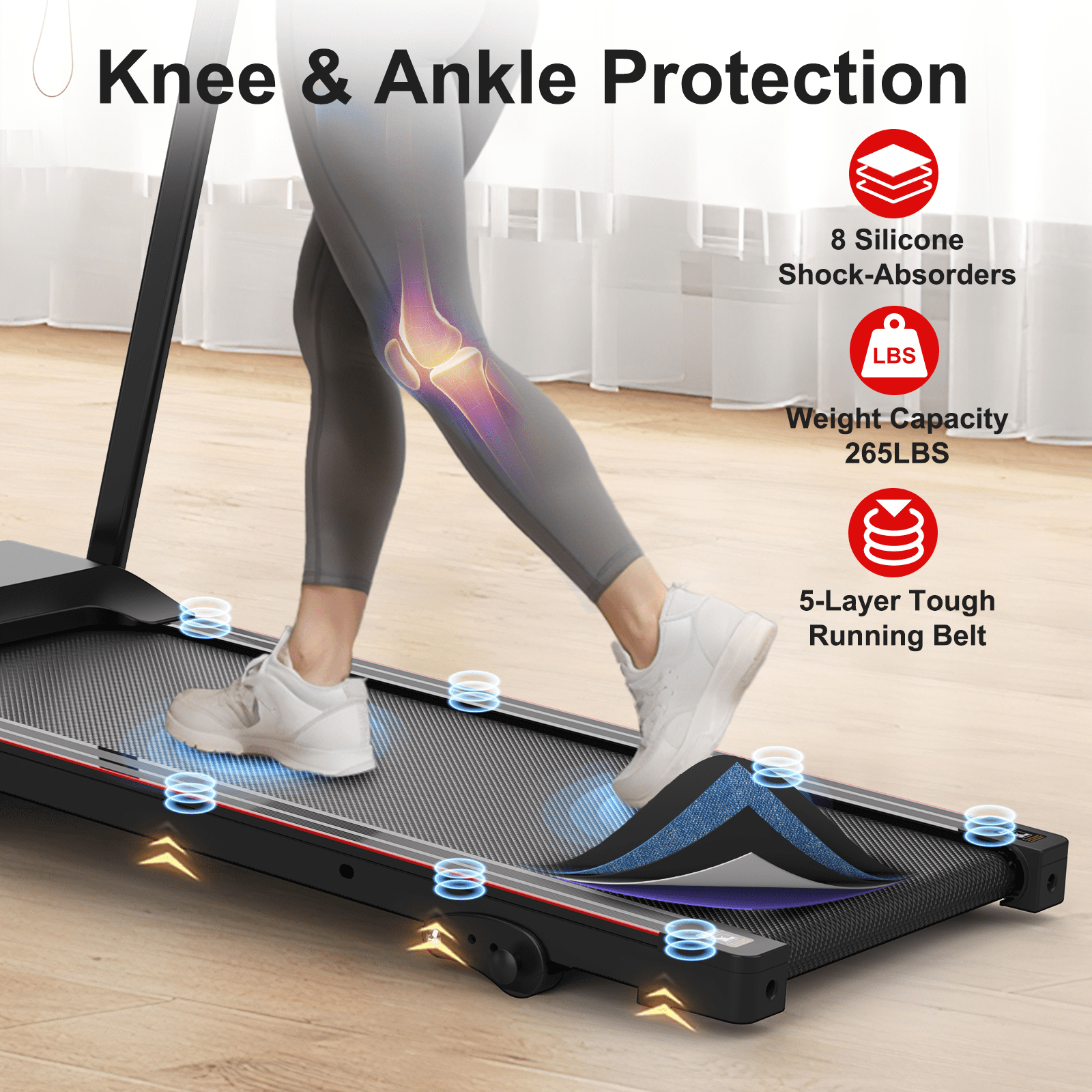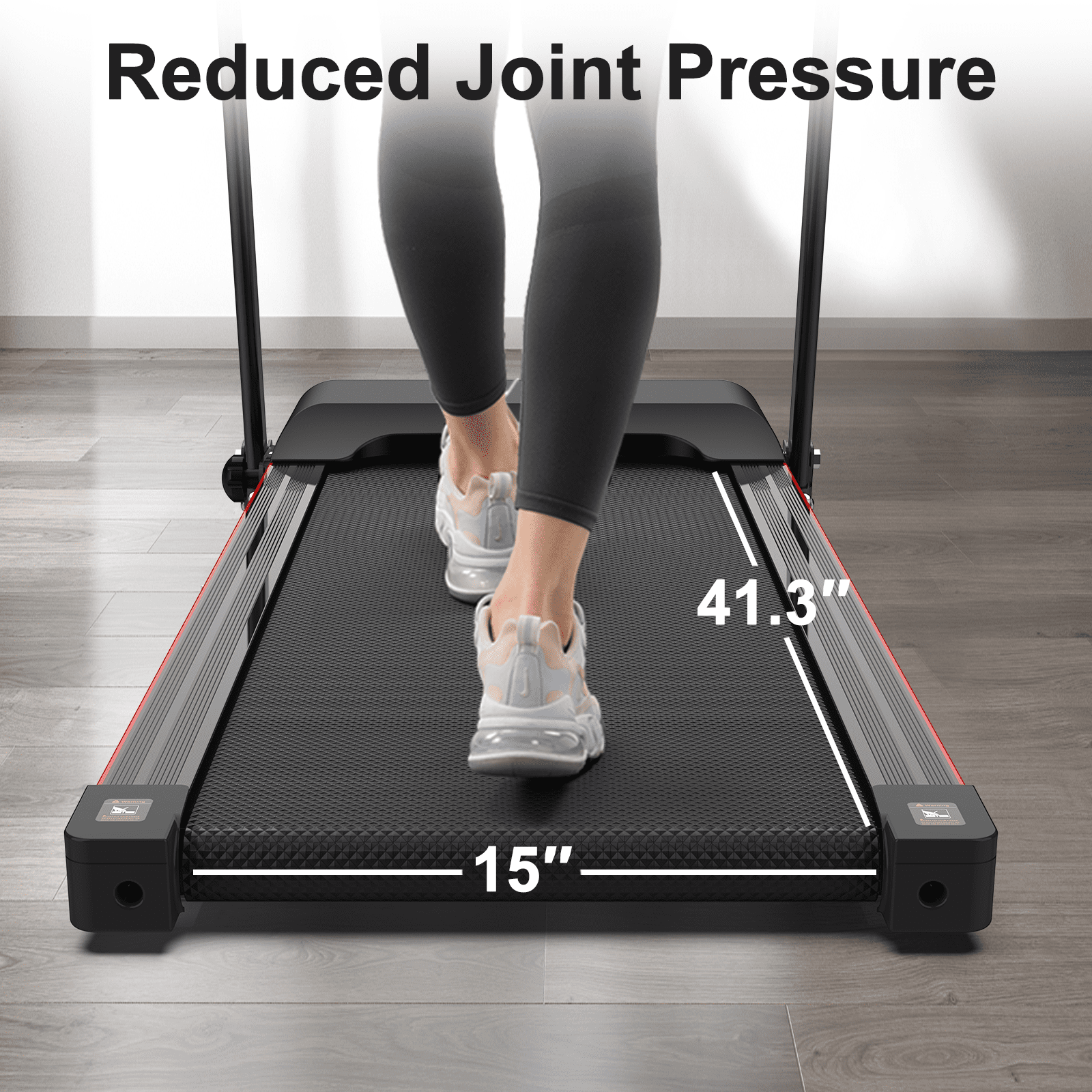 [Spacious Running Belt]The 41.3"L x14.2"W large-area running belt of foldable treadmill which provides you with a more comfortable and firmer exercise experience. Anti-slip running belt providing a safe cushion for your knees.