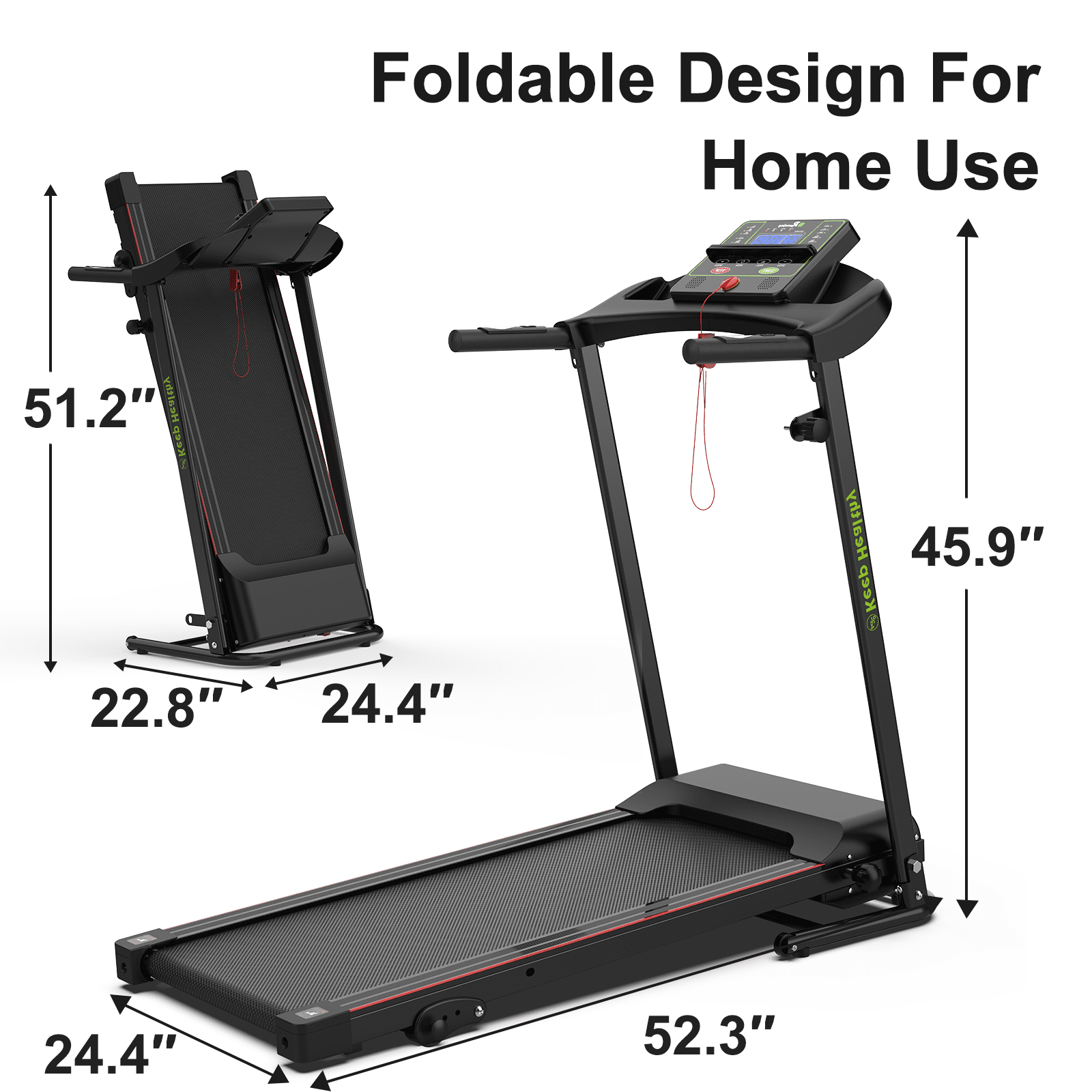 [Space Saver Design]Easy folding mechanism means your treadmill can fold up after your run for compact, simple storage.Folding area is only 24"(L) x 16.1"(W) x 49.2"(H). The 2 built-in transportation wheels make the treadmill easy to move around and store in small place at home.