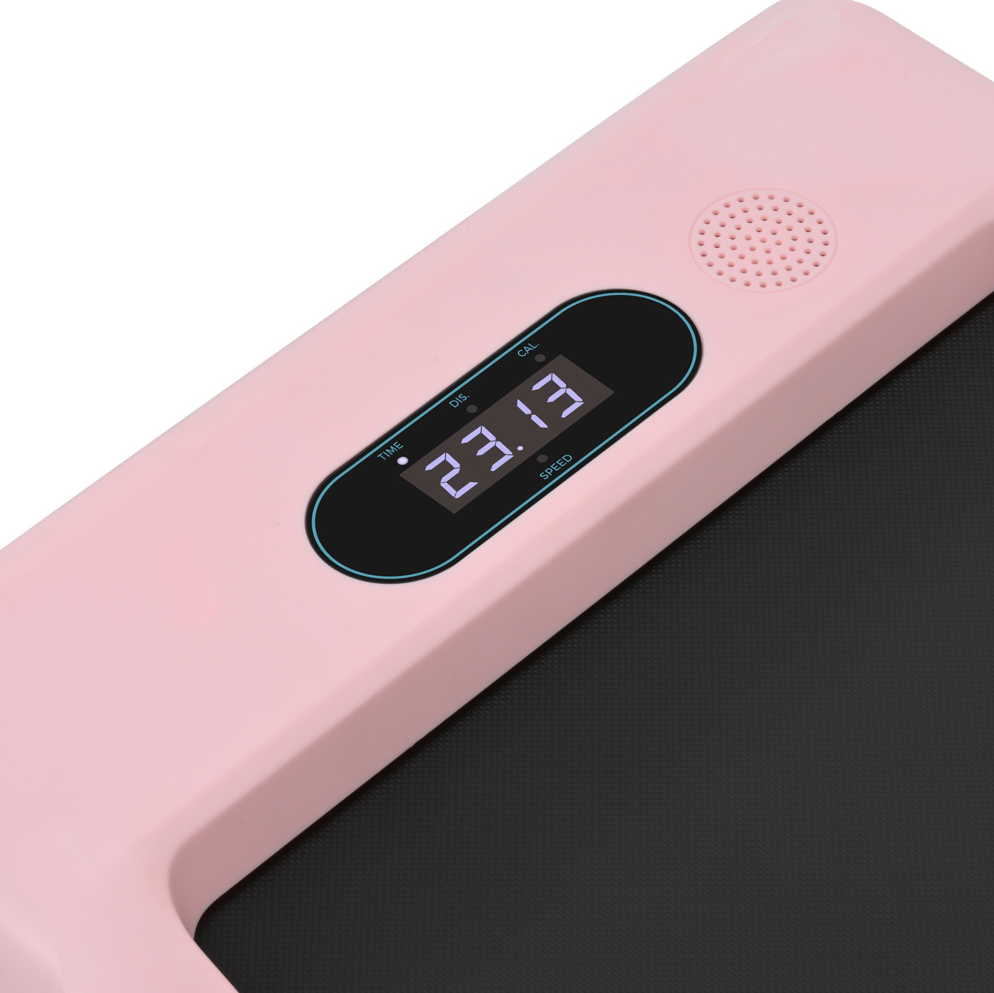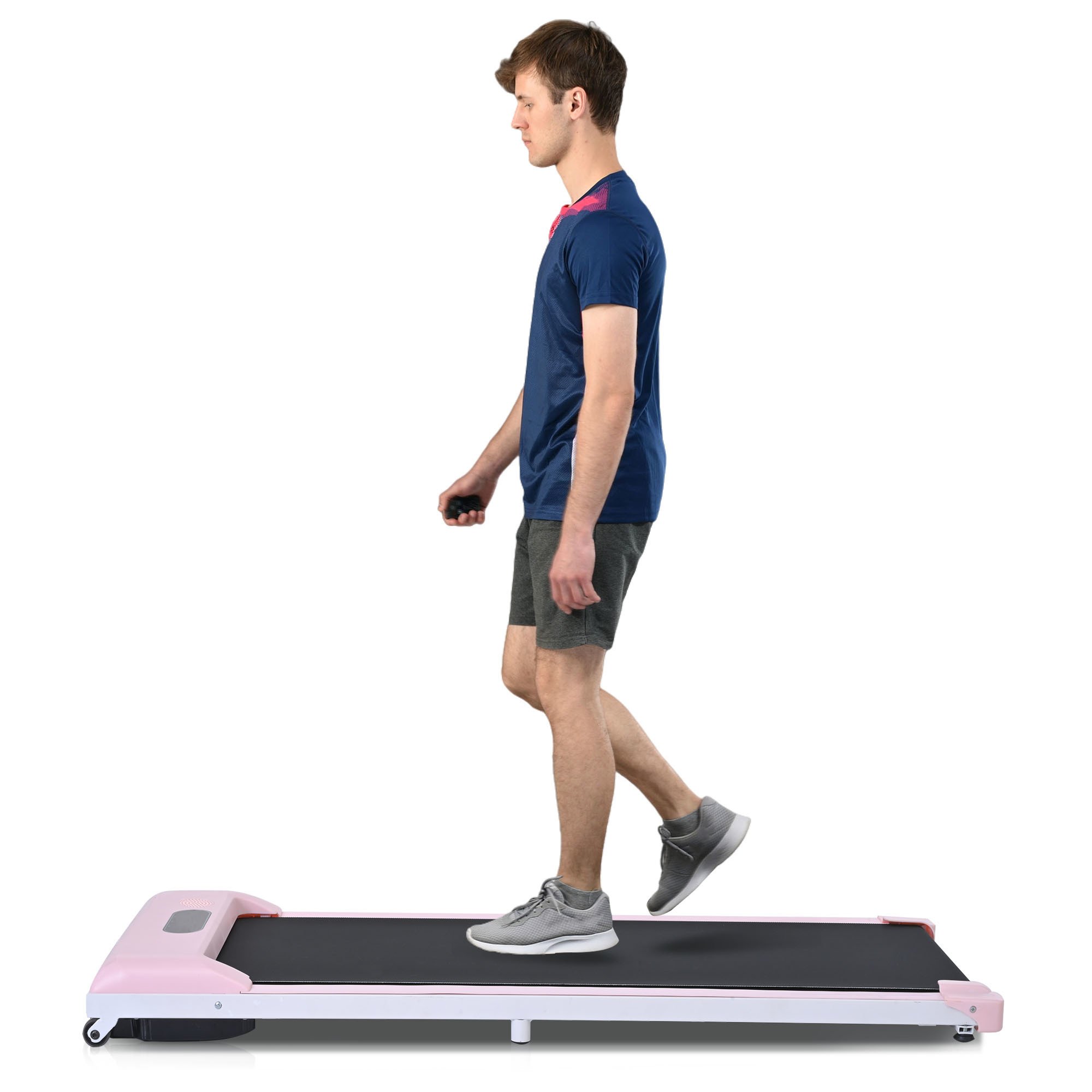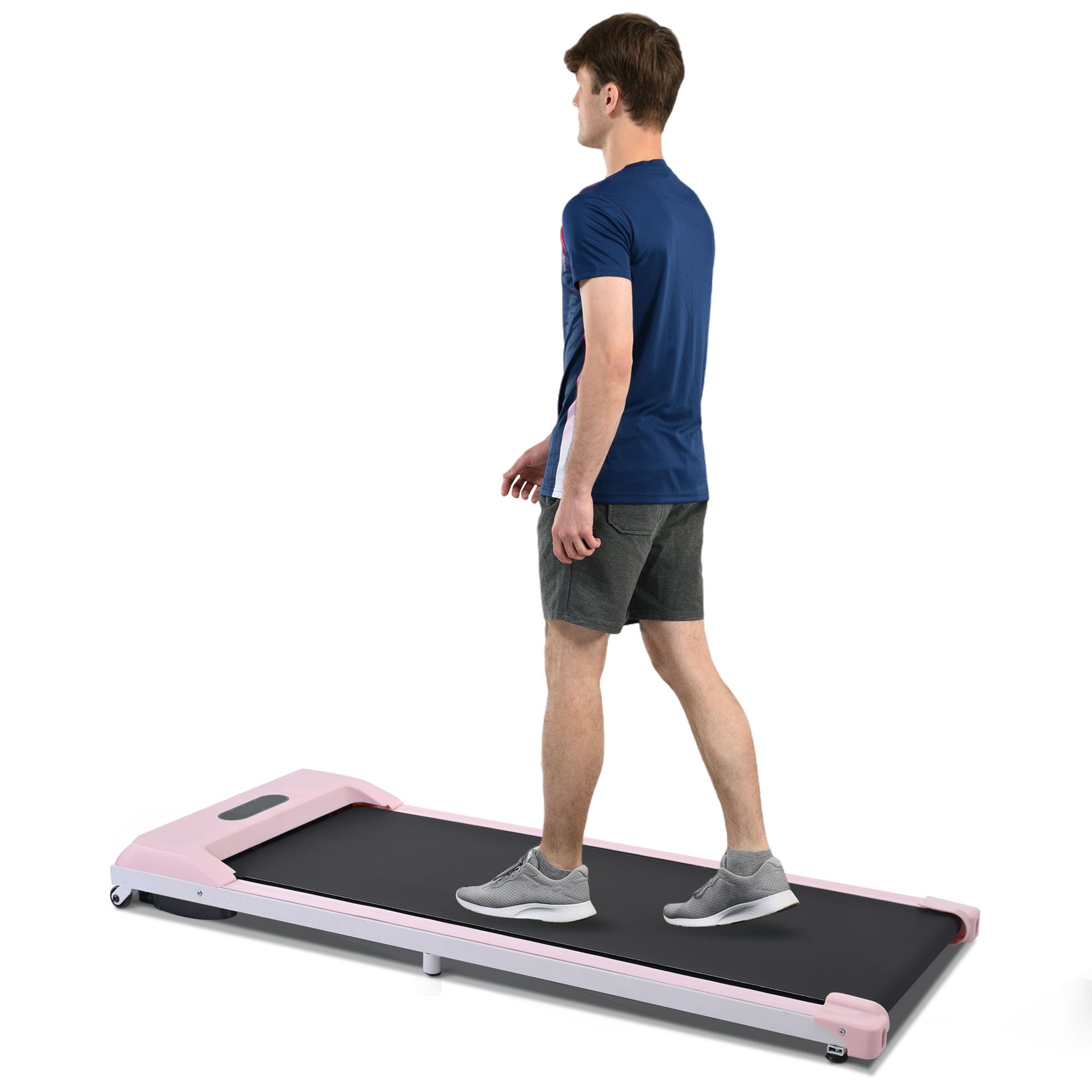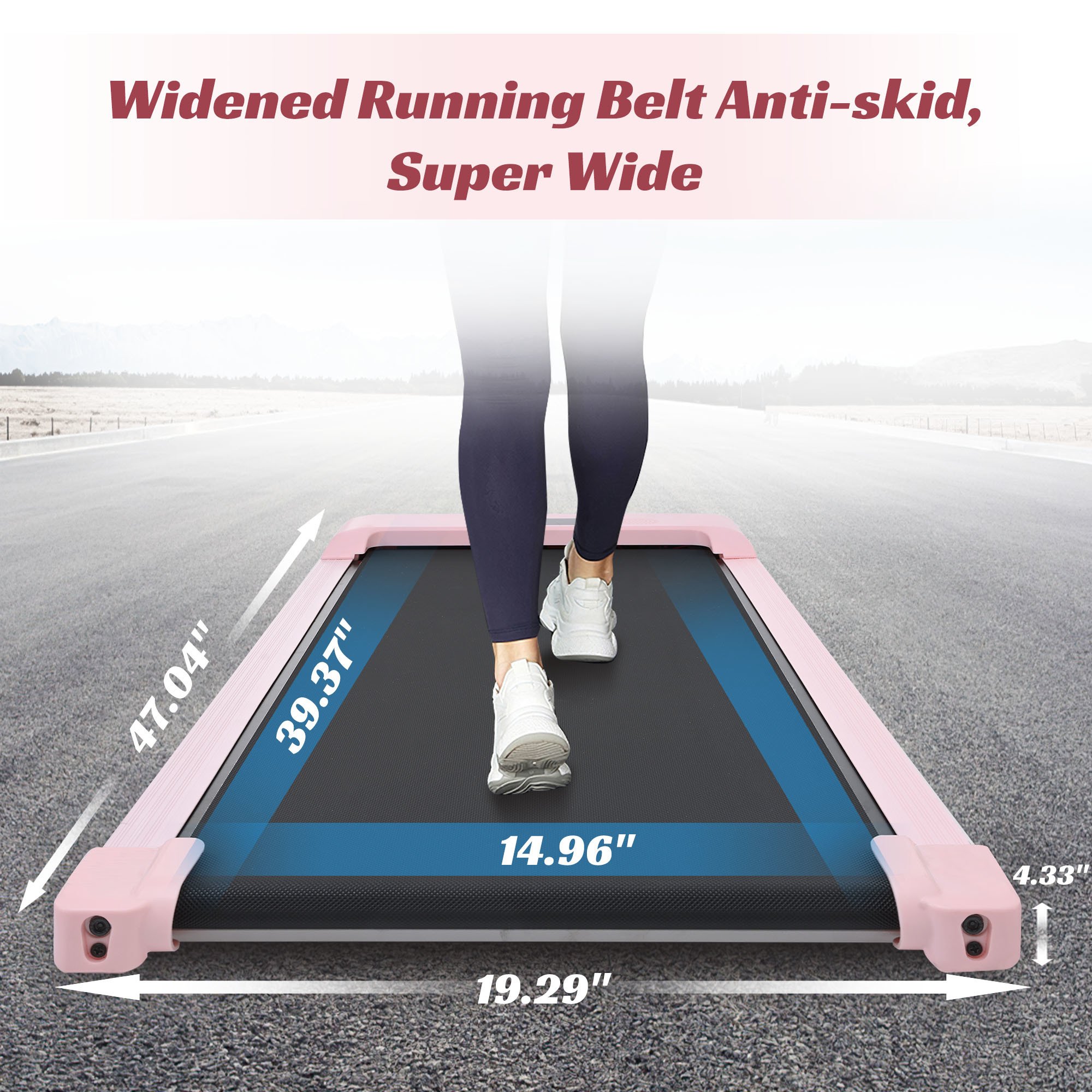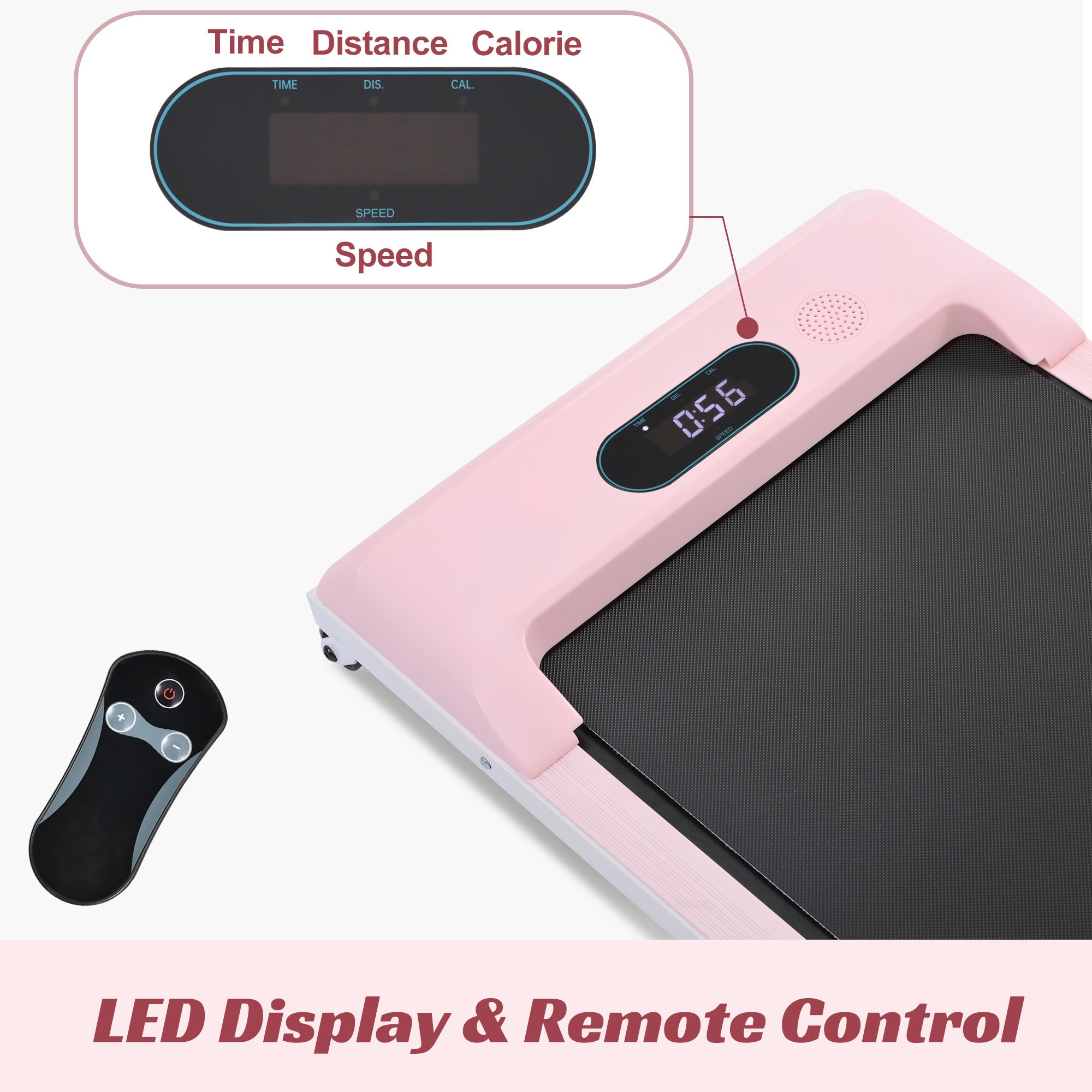 2 in 1 Under Desk Treadmill. The independent remote control can efficiently control and adjust the running speed and improve the running safety. Available in 0.5 to 4 MPH Speed levels, this walking treadmill allow you to select different speed base on your physical condition and exercise based. Maximum weight: 260lbs.With a 2.5 HP powerful quiet Motor,the electric treadmill is perfect for running, jogging, and walking in the comfort of your home. With a durable steel frame and multi-layer shield design, the under desk treadmill's shock-absorbing and noise-reducing, making your running quieter, safer and more comfortable.The LED display clearly shows time, calories, step, speed and distance, monitoring your progress in real time and keeping your movement data at a glance. No Assemble & Space-saving: Unlike the traditional treadmills, our walking and running 2 in 1 treadmill is no assemble needed, designed to be lightweight, portable and easy to store under the bed or desk. Wheels at the bottom are for easy transportation.39.37"x 14.96" Widened Running Belt Making running or walking on this treadmill more freely. 5 layers non-slip running belt and Silica gel column support will greatly absorb shock to provide cushioning for knee, muscle and joints.