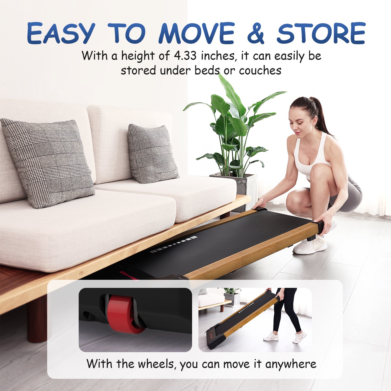 3.Ultra Light Design & Space Save: The OBENSKY mini treadmill for standing desk weighs 48 pounds and is 4.3 inches thick, whether you're in your office or apartment, you'll always find a right place to store it. Also the wheels on the front help you move and place it under sofa, corner or bed to save your home space. Max weight capacity: 265lbs.