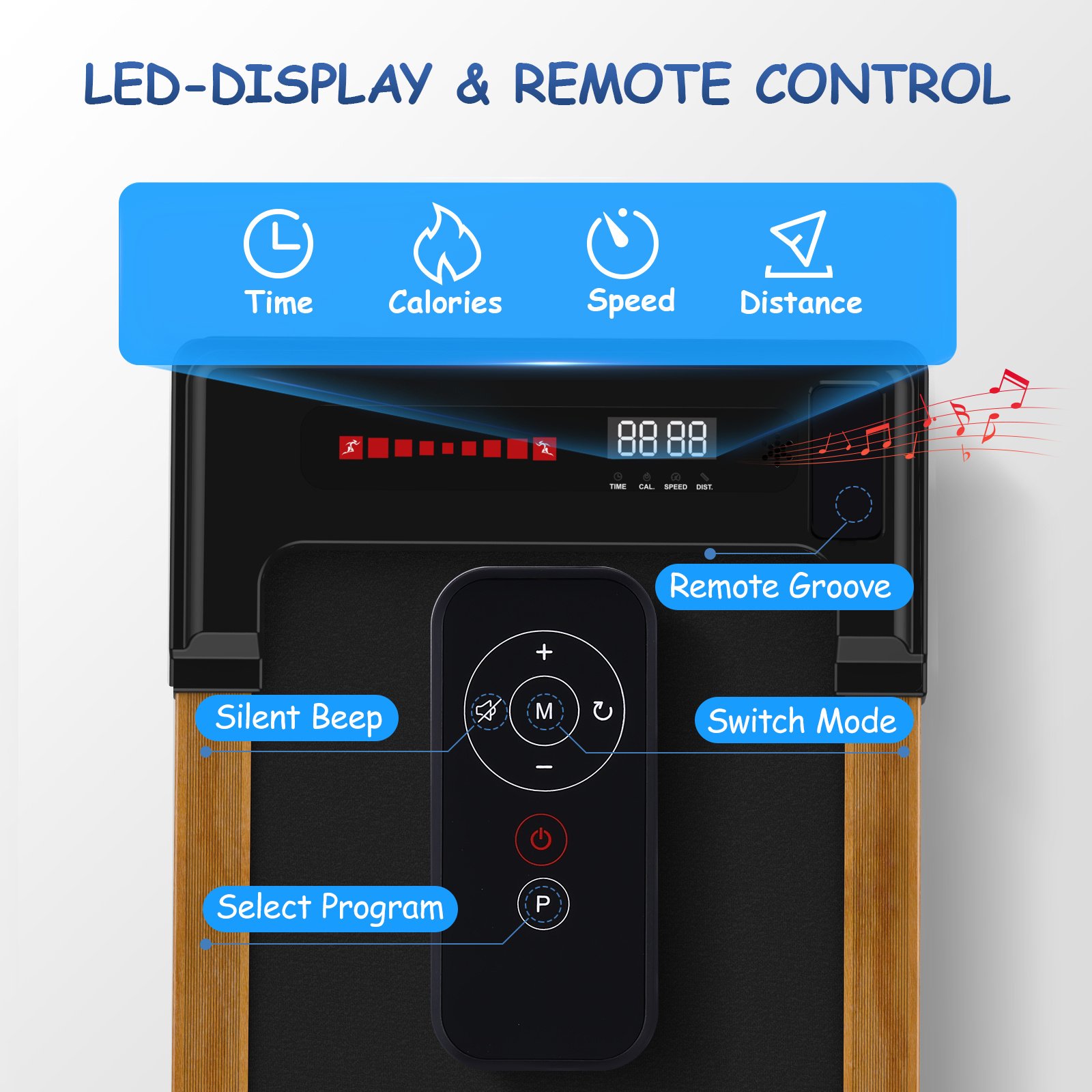 4.The LED Display & Remote Control: This portable treadmill with LED display allows you to track speed, distance, time and calories in real time, The remote control is convenient for you to adjust the speed and modes while running.