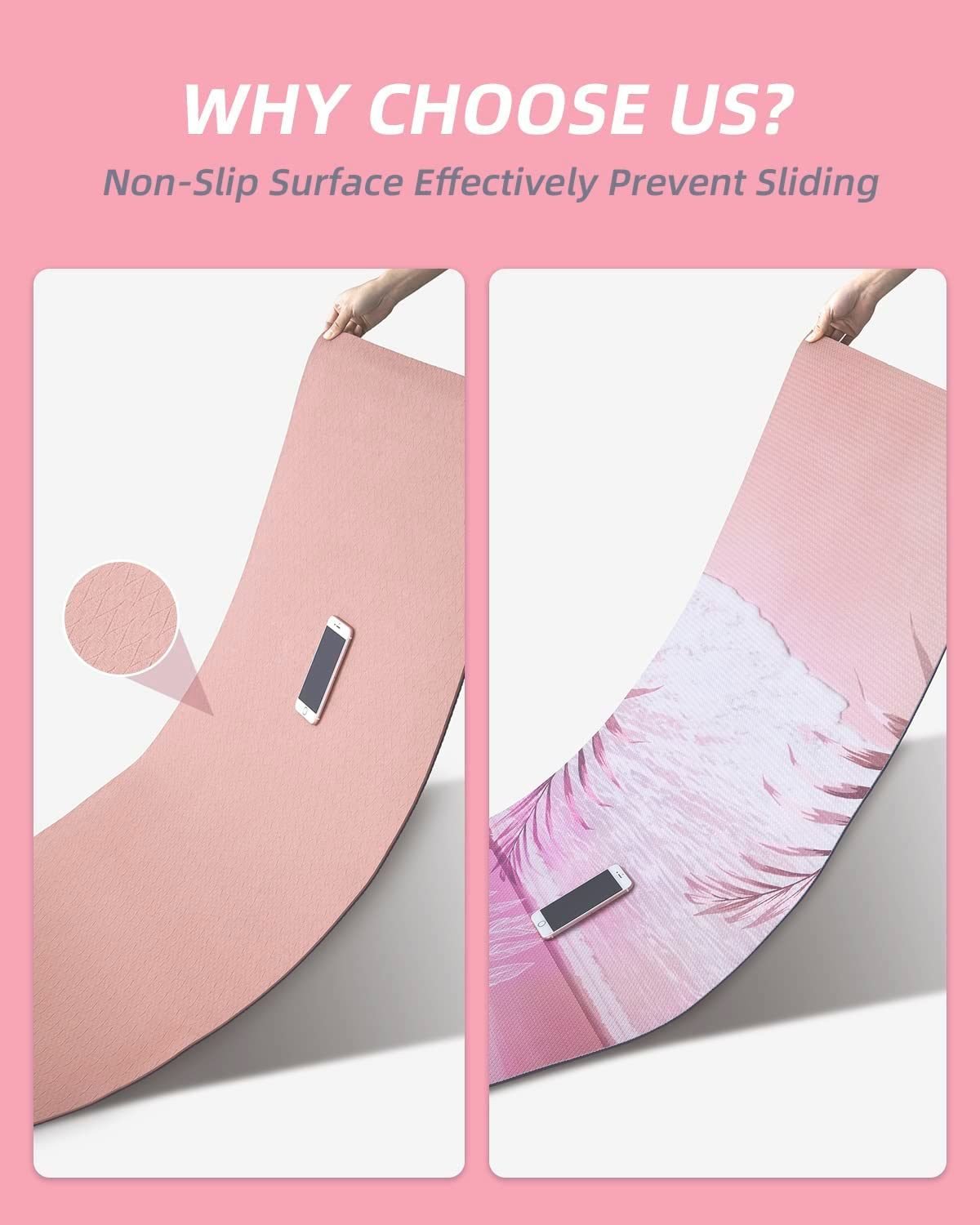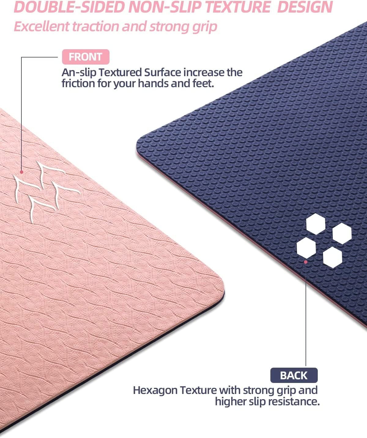 The design of anti-skid texture on both sides and Hexagon texture(unique patented non-slip pattern) on the back, features good cushioning and optimal grip. The yoga mat non slip shows the excellent anti-slipping on all kinds of grounds, for example, wood floor, cement floor,tile floor.