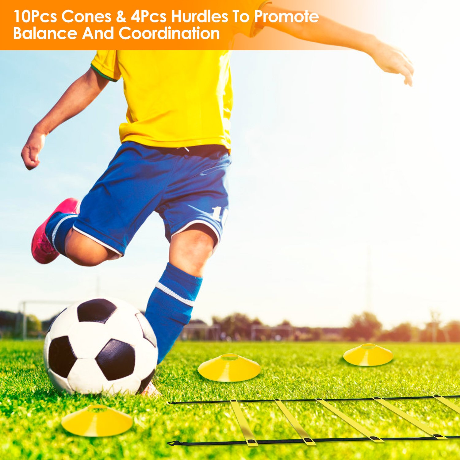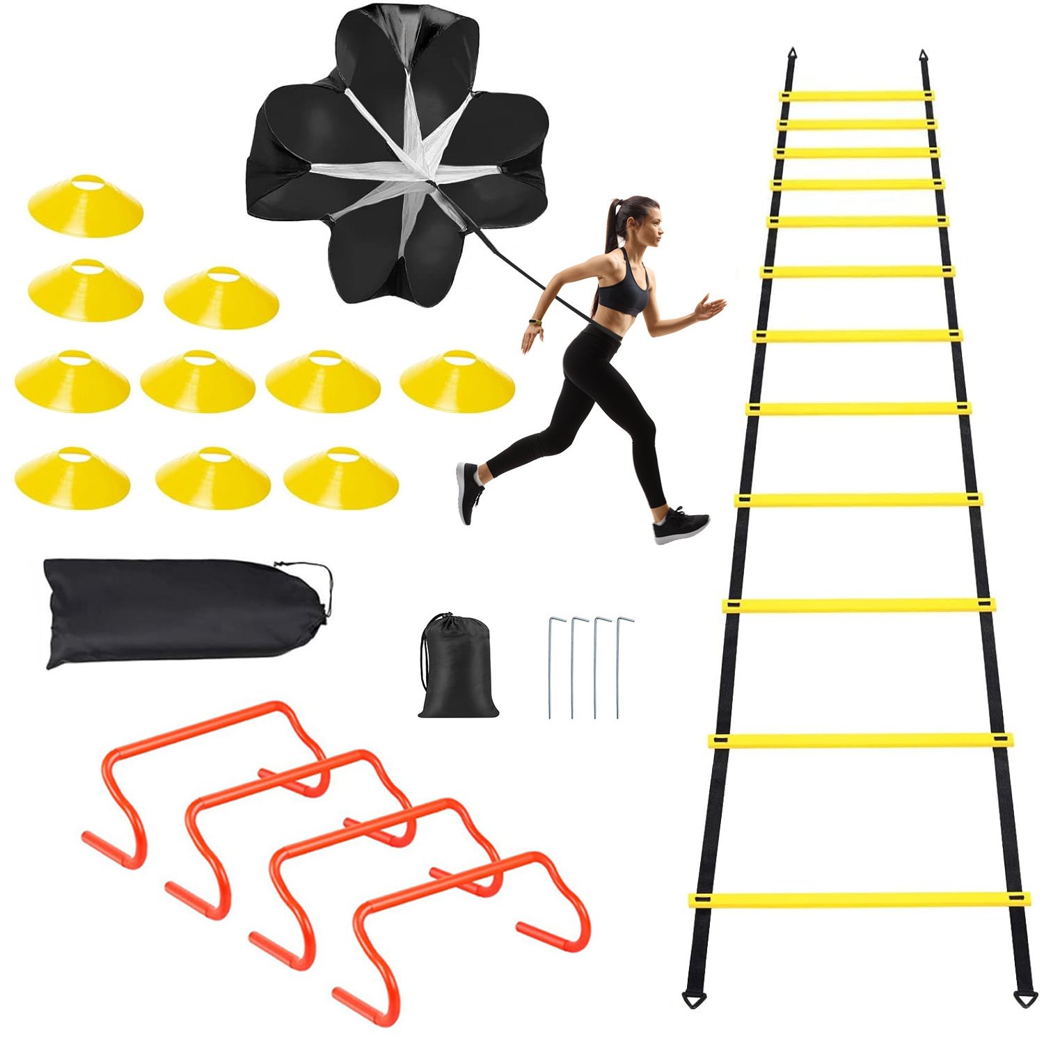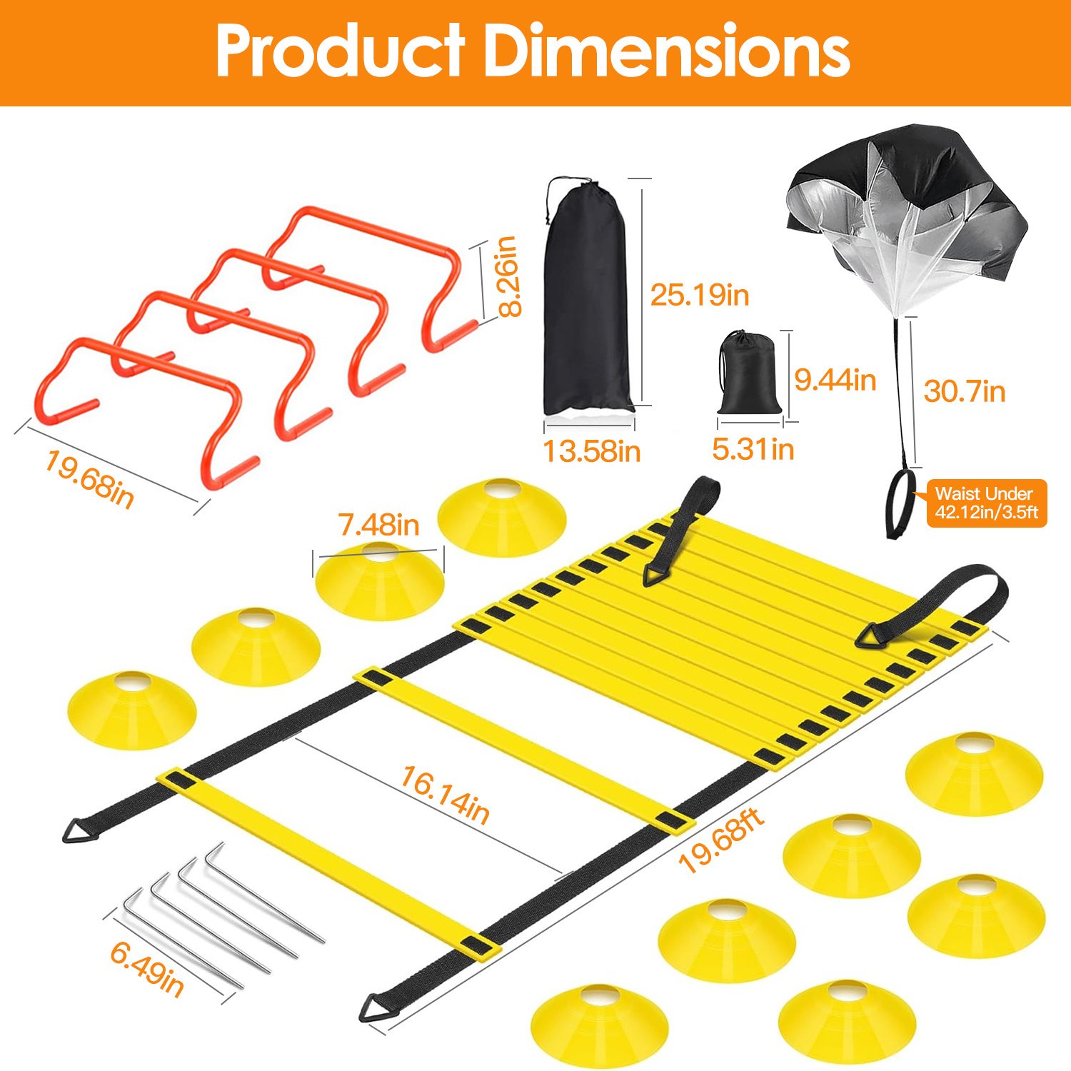*Complete Agility Training Equipment Set*:Come with rich accessories,our agility training equipment set includes 1* 19.68ft ladder,1* resistance parachute,4* agility hurdles,10*field cones,4* ground stakes,2* storage bags. A must have training kit for you to improve speed,endurance,agility,coordination,strength,balance,quickness and overall athletic performance.